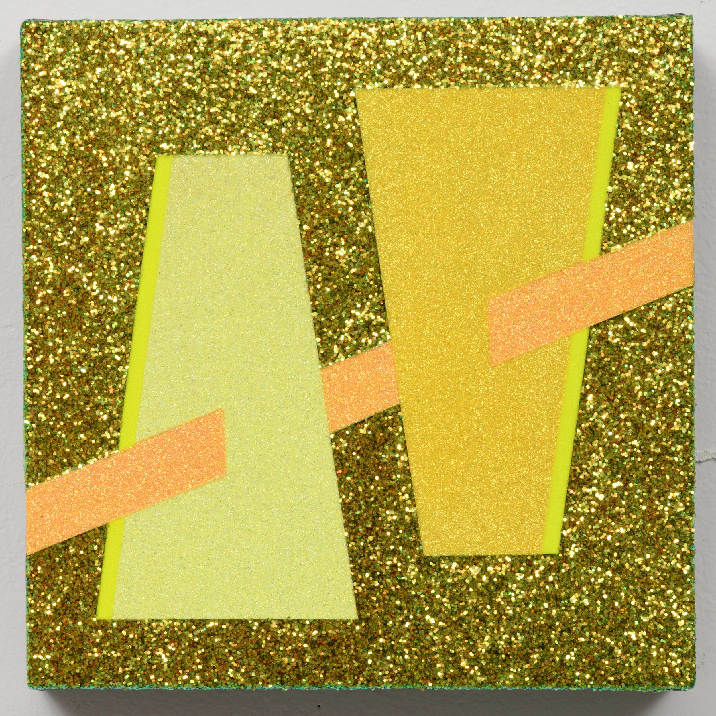 Yellow Stitch, Kelly Brumfield-Woods, 2018. Acrylic and glitter on canvas, 10 x 10 inches. KBW-79